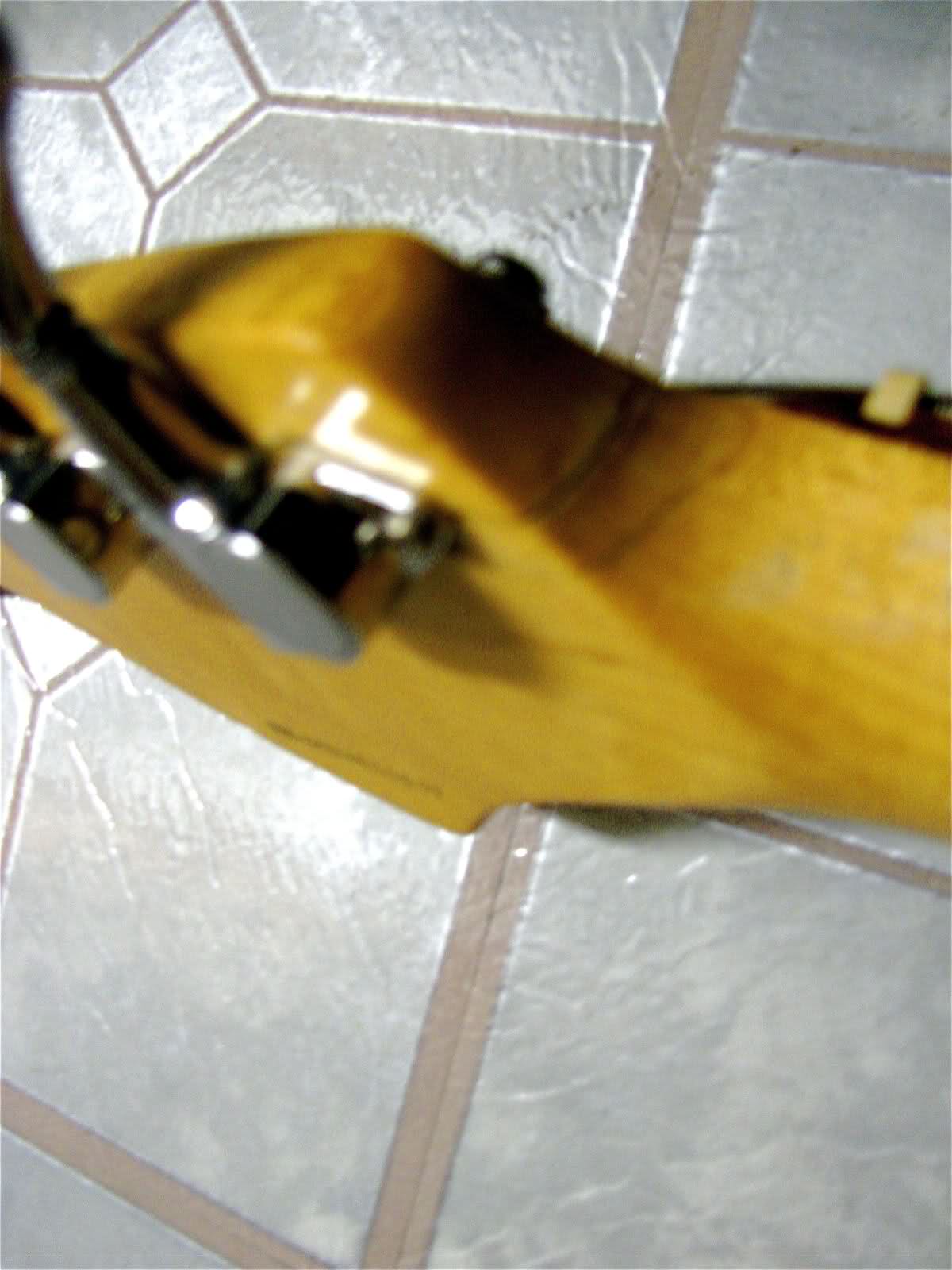 Without going into “total” detail (because, some things should not be attempted without experience), here is a rough explaination. For this particular repair, Rob Budinsky and James Healy at Action, assesed the damage, gave me a clear understanding of their action plan (pun intended), then went to work. The Crazy Glue and residue was cleaned and filed out of the poorly repaired cracks. New channels were prepared for the repair procedures. The seams and hairline cracks were Epoxied and filled. The headstock was then secured and clamped. A small dowel was inserted in the initial tuning machine hole and redrilled. The 3 pics** show the finished result. Yes, you can still see the cracks. And yes, for more cash, the cracks could have been more cosmetically appealing. More secure? Nope, just more appealing. In it’s current state, the repair is extremely solid and the bass tunes to pitch and beyond and it plays in pitch up and down the neck on every string.
